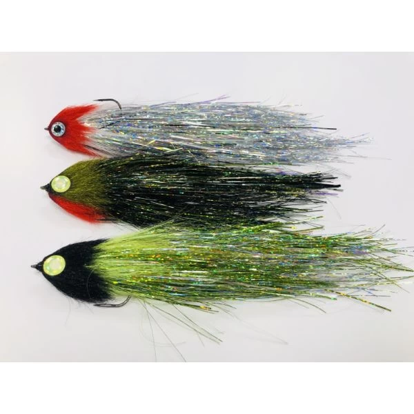Disse fluer er i bedste Bauer stil bundet på en Partridge Universal Predator #4/0 med en Ahrex PR382 Trailer krog i #1. Rigget et bundet med Knot2Kinky 55 lbs. titaniums wire og fastach clip til wiggletails. Fluen er ca. 20 cm. lang. Der er udelukkende brugt kvalitets materialer, og bundet af en rigtigt dygtig dansk fluebinder.