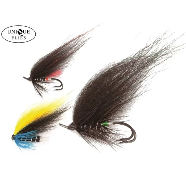 Unique Black Salmon Flies – klassiske laksefluer på rør eller med dobbeltkrog.